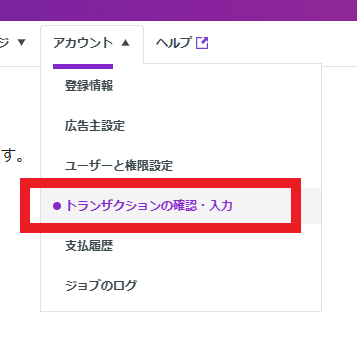 - 管理画面のアカウントのメニューから「トランザクションの確認・入力」をクリックします。