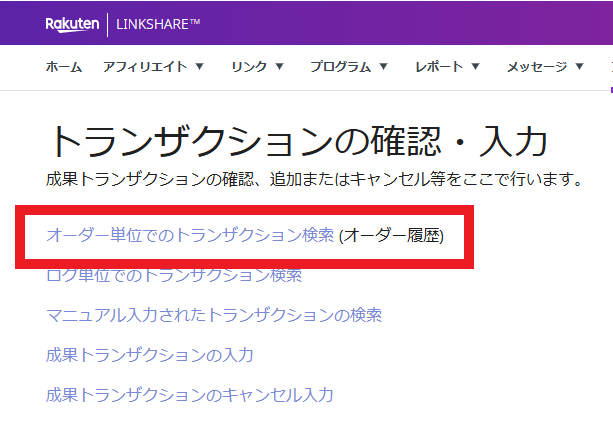 リンクシェアに送信され取り込まれたトランザクションデータ(成果データ)は、オーダー単位で検索することが可能です。