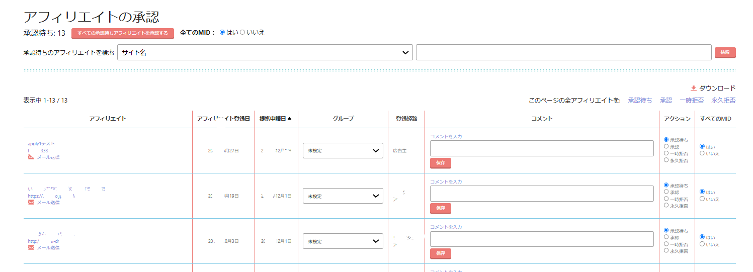 提携申請を「自動承認」するよう設定していない限り、提携申請をあげてきたアフィリエイトサイトを以下の手順で審査した上で承認・拒否を行う必要があります。