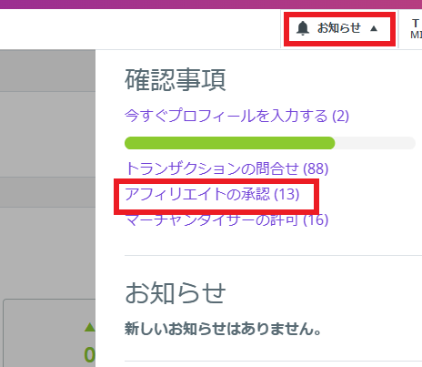 管理画面トップページの左上『確認事項』の欄に表示されるアフィリエイトの承認をクリック。