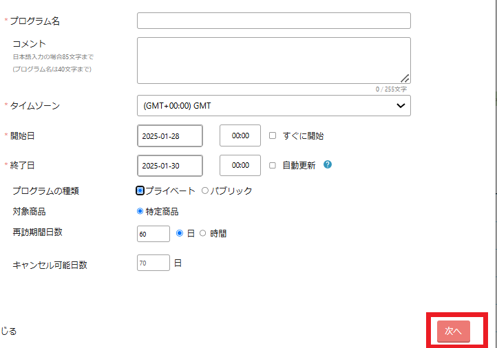 ・プログラム名 - プロモーションの名前を入力します。プロモーションの内容がわかるような名称にしてください。