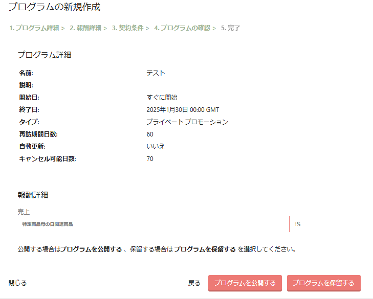・プログラムの種類 - 「パブリック」を選択した場合はすべての提携アフィリエイトを対象とし、「プライベート」を選択したい場合は特定のアフィリエイトのみを対象とします。