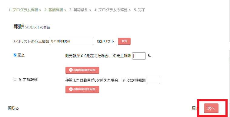 プロモーションの報酬条件を設定した上で「次へ」ボタンをクリックします。