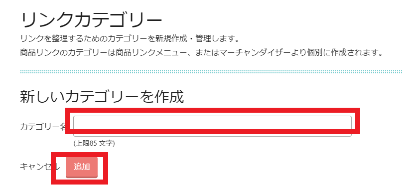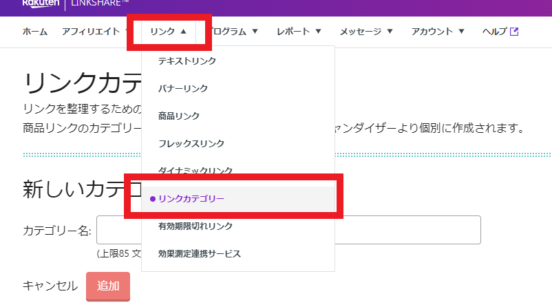各種リンクを管理するために、リンクのカテゴリーを作成することができます。リンク作成時にここで作成したカテゴリーを紐づけることで、アフィリエイトにとっては使用したいリンクを探しやすくなります。