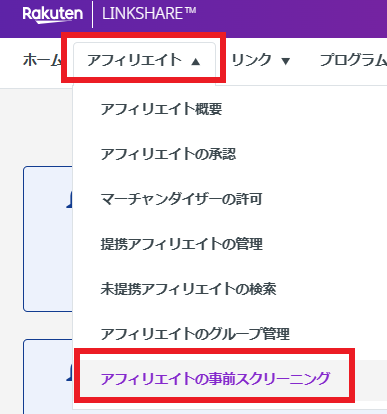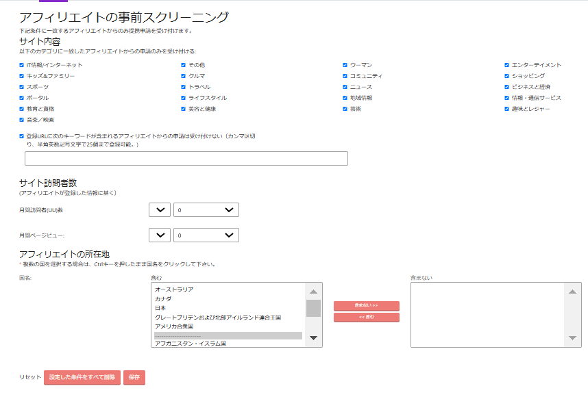 なお、アフィリエイト様から提携申請時に「申請条件を満たしていません」といったメッセージが表示され申請ができないというお問い合わせがあった場合はこちらのアフィリエイトの事前スクリーニングに設定がされていないかご確認をお願いいたします。