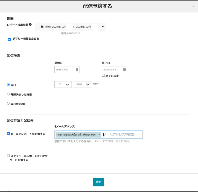 2.配信予約設定画面が表示されますので必要に応じてレポート抽出期間や、配信時時刻