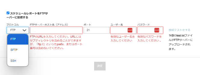 「スケジュールレポートをFTPサーバーに配信する」のメニューから指定のサーバーに自動で格納するように設定することも可能です。