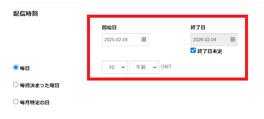 「毎日」指定の場合、開始日と終了日、時刻を設定してください。