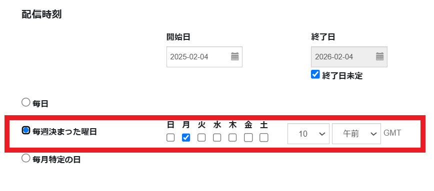 「毎週決まった曜日」の場合、配信希望の曜日と時刻を設定してください。
