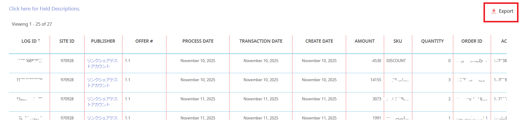 Once the search results are displayed, click "Download" to download the data as a CSV file. The extracted transaction data includes information such as Order ID, purchase date, amount, SKU, and affiliate number. Please cross-reference the order information in this downloaded data with the purchase history in your company's core system to identify orders eligible for cancellation.